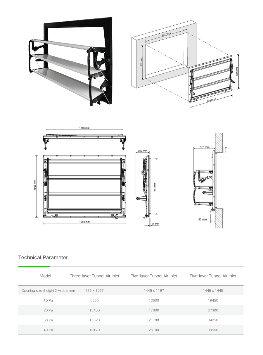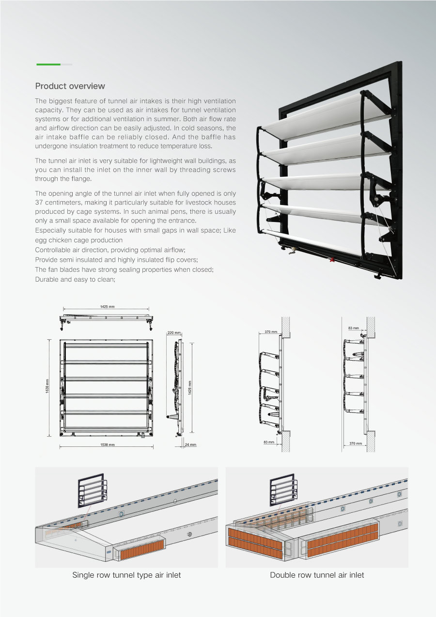 The biggest feature of tunnel air intakes is their high ventilation capacity. They can be used as air intakes for tunnel ventilation systems or for additional ventilation in summer. Both air flow rate and airflow direction can be easily adjusted. In cold seasons, the air intake baffle can be reliably closed. And the baffle has undergone insulation treatment to reduce temperature loss.