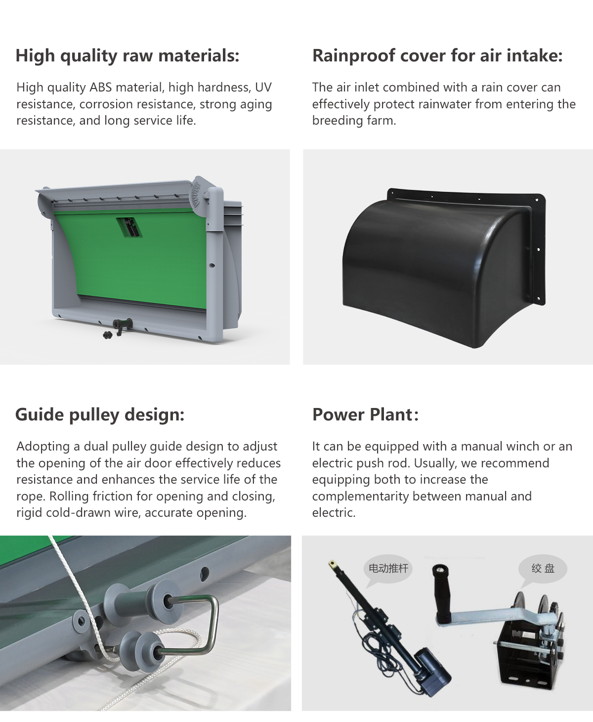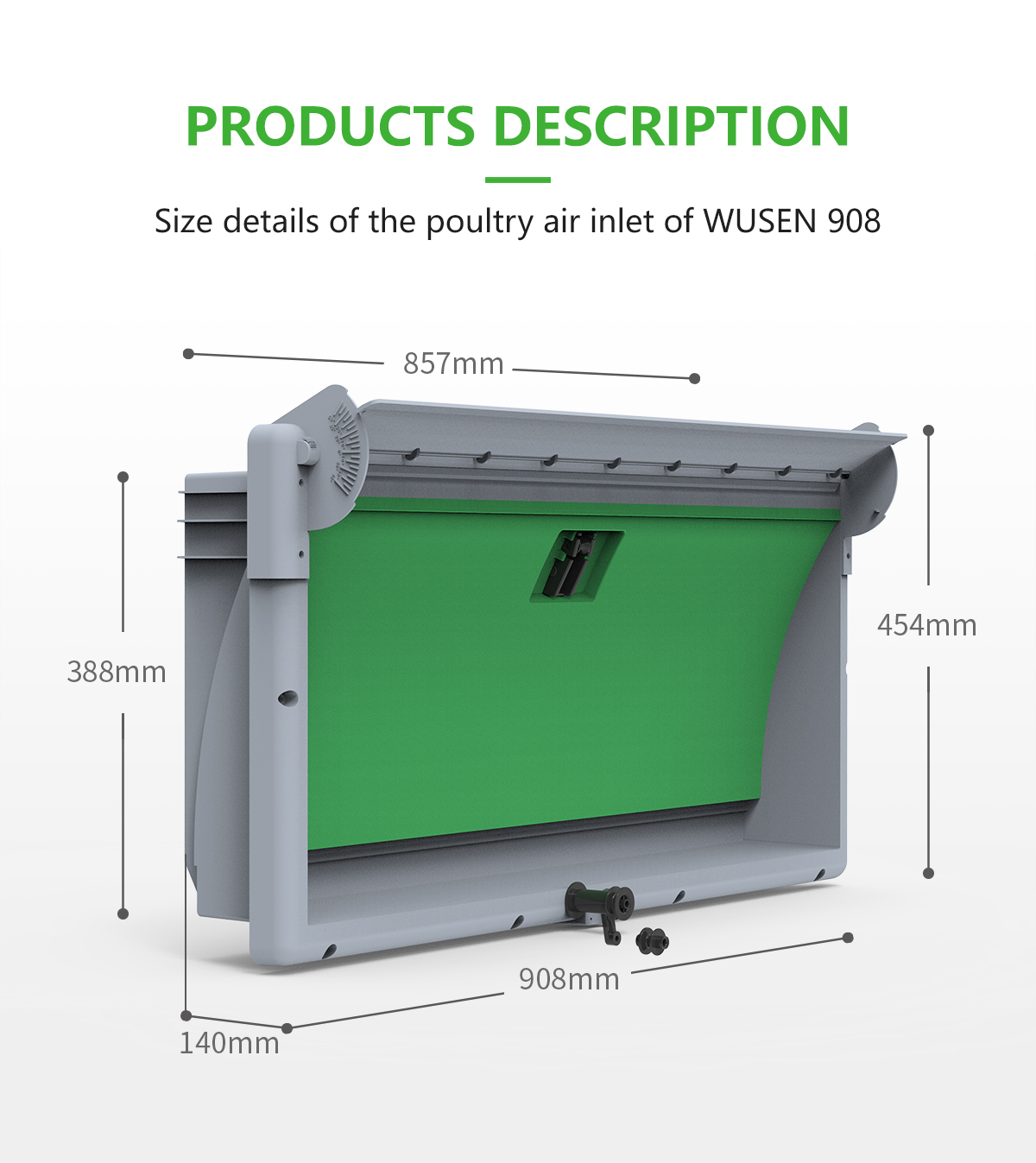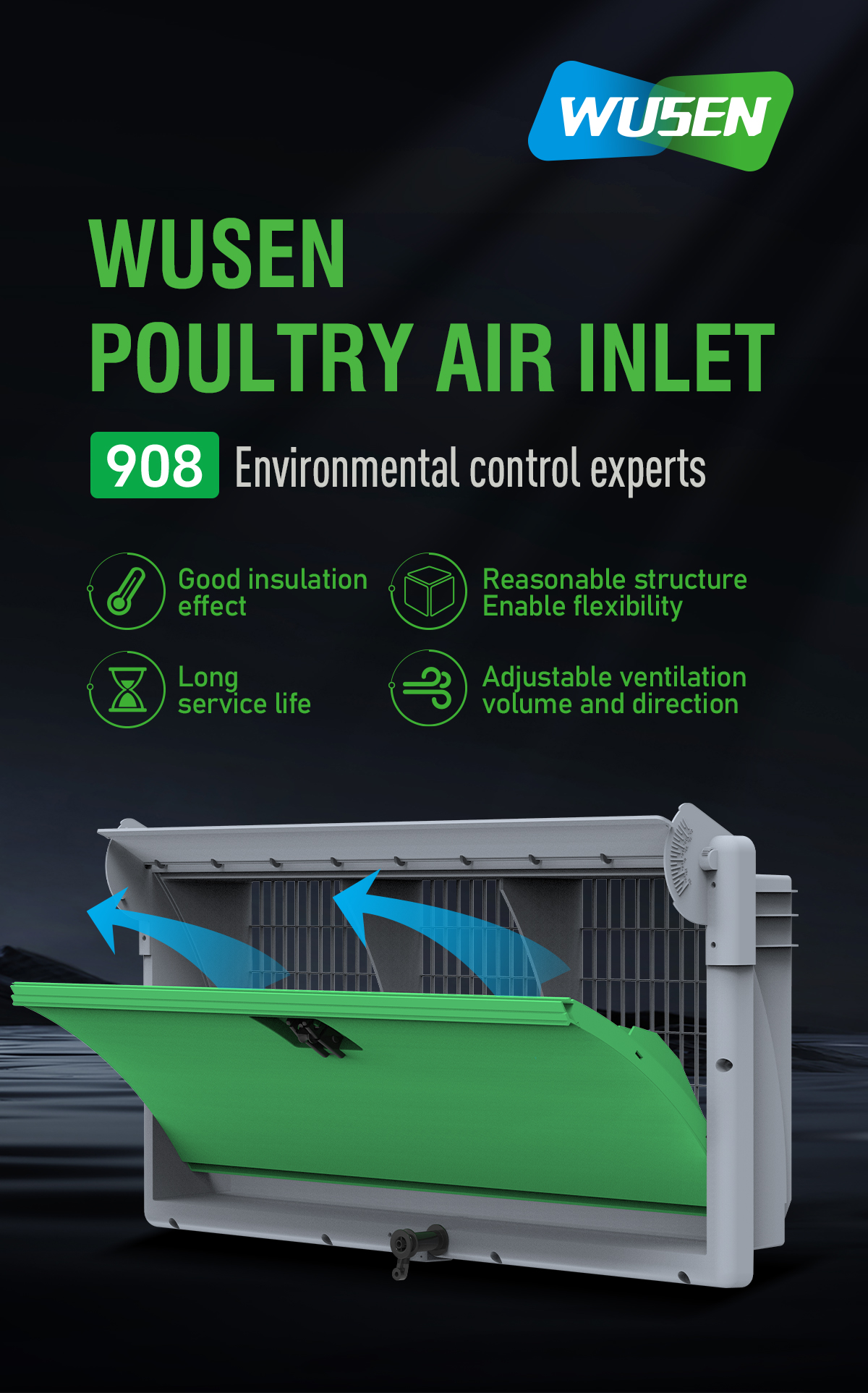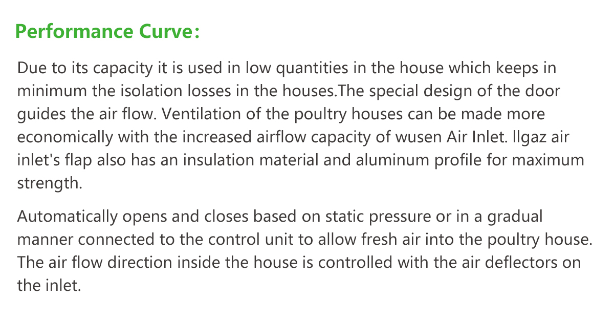 Due to its capacity it is used in low quantities in the house which keeps in minimum the isolation losses in the houses.The special design of the door guides the air flow. Ventilation of the poultry houses can be made more economically with the increased airflow capacity of wusen Air Inlet. llgaz air inlet’s flap also has an insulation material and aluminum profile for maximum strength.