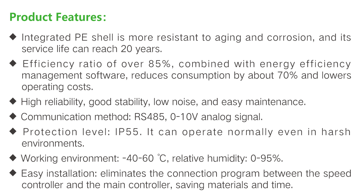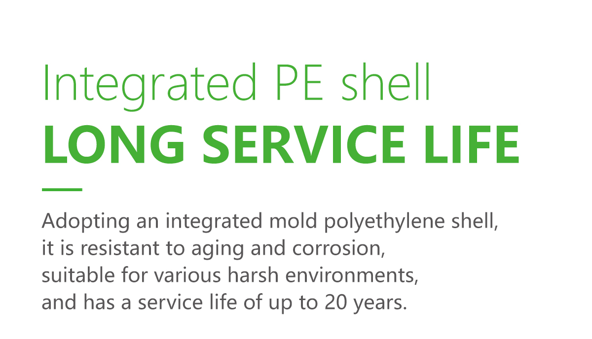The integrated PE shell is more resistant to aging andcorrosion, with a service life of up to 20 years.The efficiency ratio exceeds 85%, and combined withenergy efficiency management software, it can reduceenergy consumption by approximately 70% and loweroperating costs.