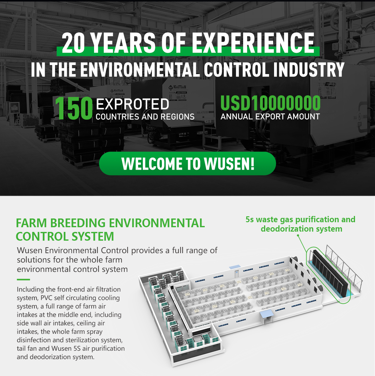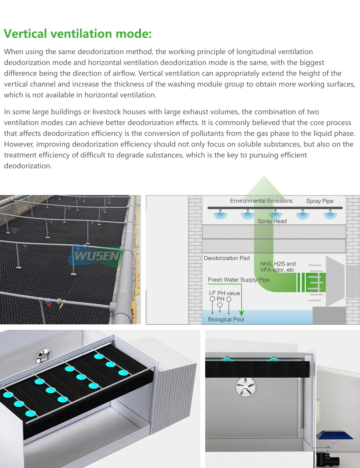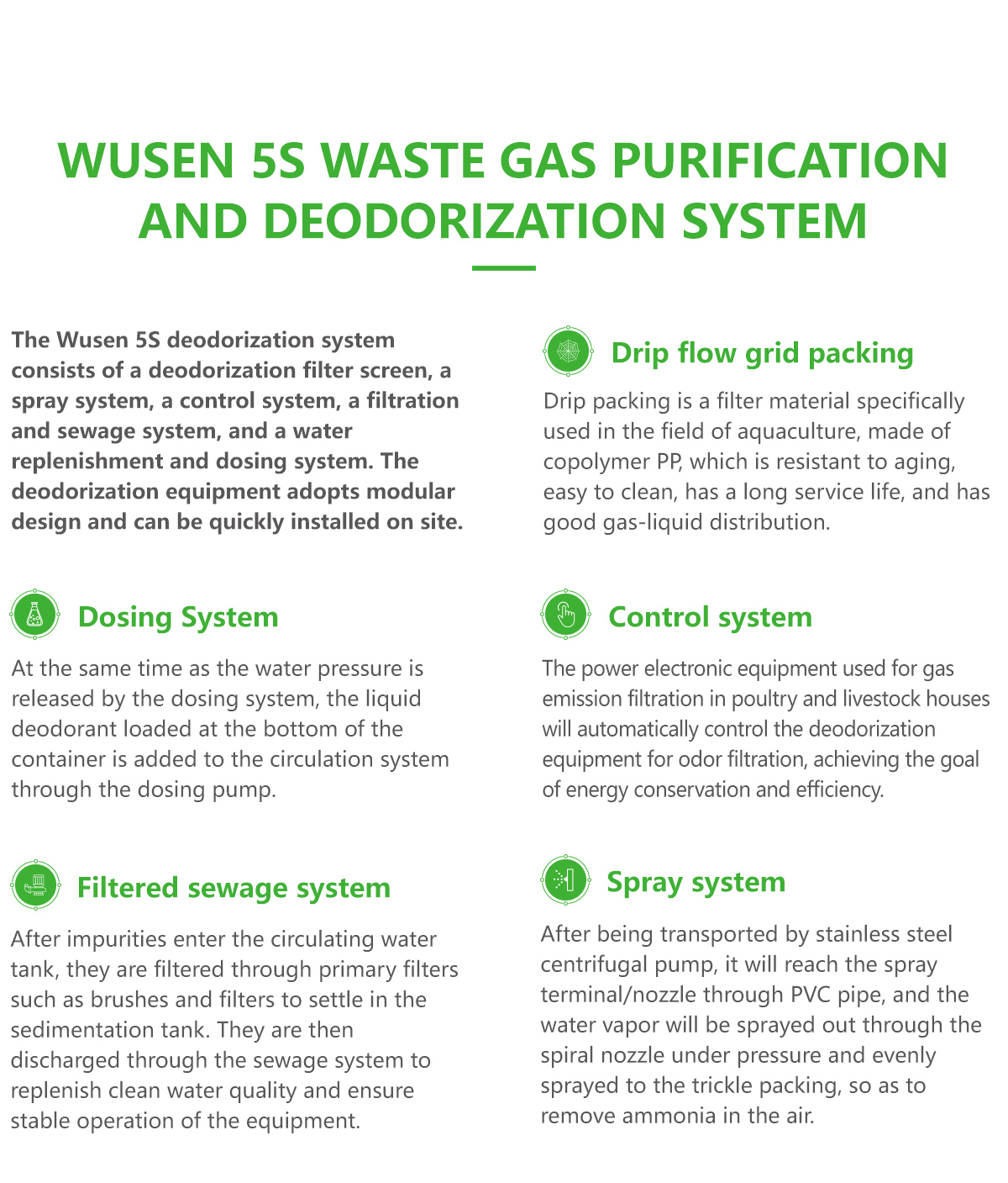 WUSEN 5S廢氣純化和除臭系統是一種有效的空氣純化解決方案,專門為諸如繁殖農場諸如清除氣氣中的氣味和其他有害物質之類的地方設計。該系統主要由多種設備組成,例如除臭水窗簾,循環噴霧,過濾系統,劑量系統,智能控制等。遙控操作是可能的。除臭模塊是系統的核心部分,該模塊配備了專門的除臭材料,可以有效地從廢氣中清除有臭味的物質。 Wusen 5s的排氣淨化和除臭系統適用於各種農場,例如豬場,雞場,黑人士兵飛行農場等。同時,它也可以應用於其他需要排氣純化處理的地方,例如污水處理廠,例如污水處理廠
