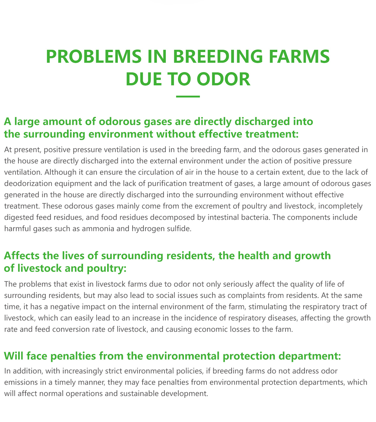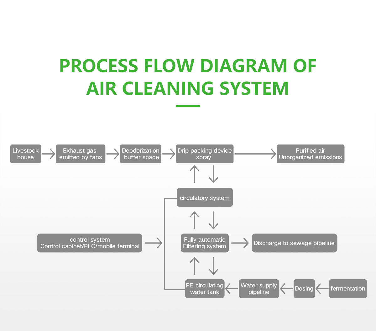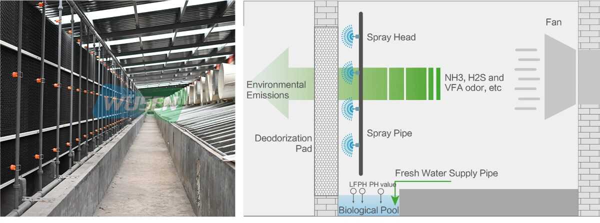 WUSEN 5S廢氣純化和除臭系統是一種有效的空氣純化解決方案,專門為諸如繁殖農場諸如清除氣氣中的氣味和其他有害物質之類的地方設計。該系統主要由多種設備組成,例如除臭水窗簾,循環噴霧,過濾系統,劑量系統,智能控制等。遙控操作是可能的。除臭模塊是系統的核心部分,該模塊配備了專門的除臭材料,可以有效地從廢氣中清除有臭味的物質。 Wusen 5s的排氣淨化和除臭系統適用於各種農場,例如豬場,雞場,黑人士兵飛行農場等。同時,它也可以應用於其他需要排氣純化處理的地方,例如污水處理廠,例如污水處理廠